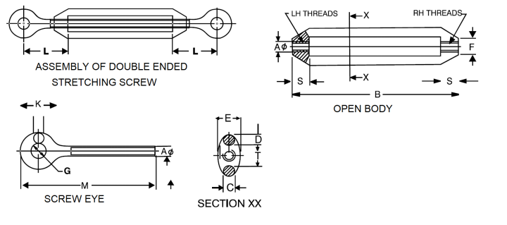 An open body consisting of two reins connecting a box at eacch end, with a central hole threaded in opposite hand, into whicch fittings of optional form (like Stud eye, Elongated eye, Screwed Fork Jaw, Hook) having screwed shanks are fitted.